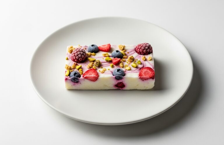<!– wp:wpzoom-recipe-card/block-recipe-card {"recipeTitle":"My Ultimate Frozen Yogurt Bark Recipe: A Simple 5-Step Treat Ready in Minutes!","summary":"A beautifully simple, endlessly customisable, and refreshingly healthy frozen yogurt bark. It’s a canvas for your favourite fruits and flavours, a perfect treat for a sunny day that brings a smile to my face, just like my mum's used to.","course":["Dessert","Snack","Healthy Treat"],"cuisine":["American","British","Healthy"],"keywords":["frozen yogurt bark","healthy snack","summer dessert","easy berry recipe"],"ingredients":[{"name":"500g full-fat Greek yogurt"},{"name":"3 tbsp honey or maple syrup, to taste"},{"name":"1 tsp vanilla extract"},{"name":"150g mixed fresh berries (strawberries, blueberries, raspberries)"},{"name":"2 tbsp granola or chopped nuts"},{"name":"1 tbsp desiccated coconut (optional)"}],"steps":[{"text":"Line a small baking tray with parchment paper, ensuring it overhangs slightly for easy lifting."},{"text":"In a medium bowl, gently stir together the Greek yogurt, honey (or maple syrup), and vanilla extract until just combined. Don't overmix."},{"text":"Pour the yogurt mixture onto the prepared baking tray and use a spatula to spread it into an even layer, about 1/4-inch thick."},{"text":"Scatter your fresh berries, granola, and optional coconut evenly over the top. Gently press them into the yogurt if you wish."},{"text":"Carefully place the tray in the freezer and let it set until completely firm, which usually takes about 3-4 hours."},{"text":"Once solid, lift the parchment paper out of the tray and break the bark into irregular, snack-sized pieces. Serve immediately and enjoy the taste of pure joy!"}],"details":[{"jsonKey":"prepTime","value":"10","unit":"minutes"},{"jsonKey":"cookTime","value":"0","unit":"minutes"},{"jsonKey":"restingTime","value":"3","unit":"hours"},{"jsonKey":"servings","value":"8","unit":"servings"},{"jsonKey":"calories","value":"115","unit":"kcal"}],"notes":"Store any leftovers in an airtight container in the freezer for up to 2 weeks for the best taste and texture.